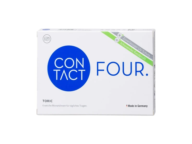 Les lentilles Contact Four Toric sont des lentilles de contact toriques souples de qualité Premium. Les lentilles toriques sont utilisées pour corriger l’astigmatisme. Les lentilles du fabricant de lentilles Premium allemand Wöhlk sont constituées d’Ocufilcon F, un matériau particulièrement résistant à la déchirure et doux pour les yeux.